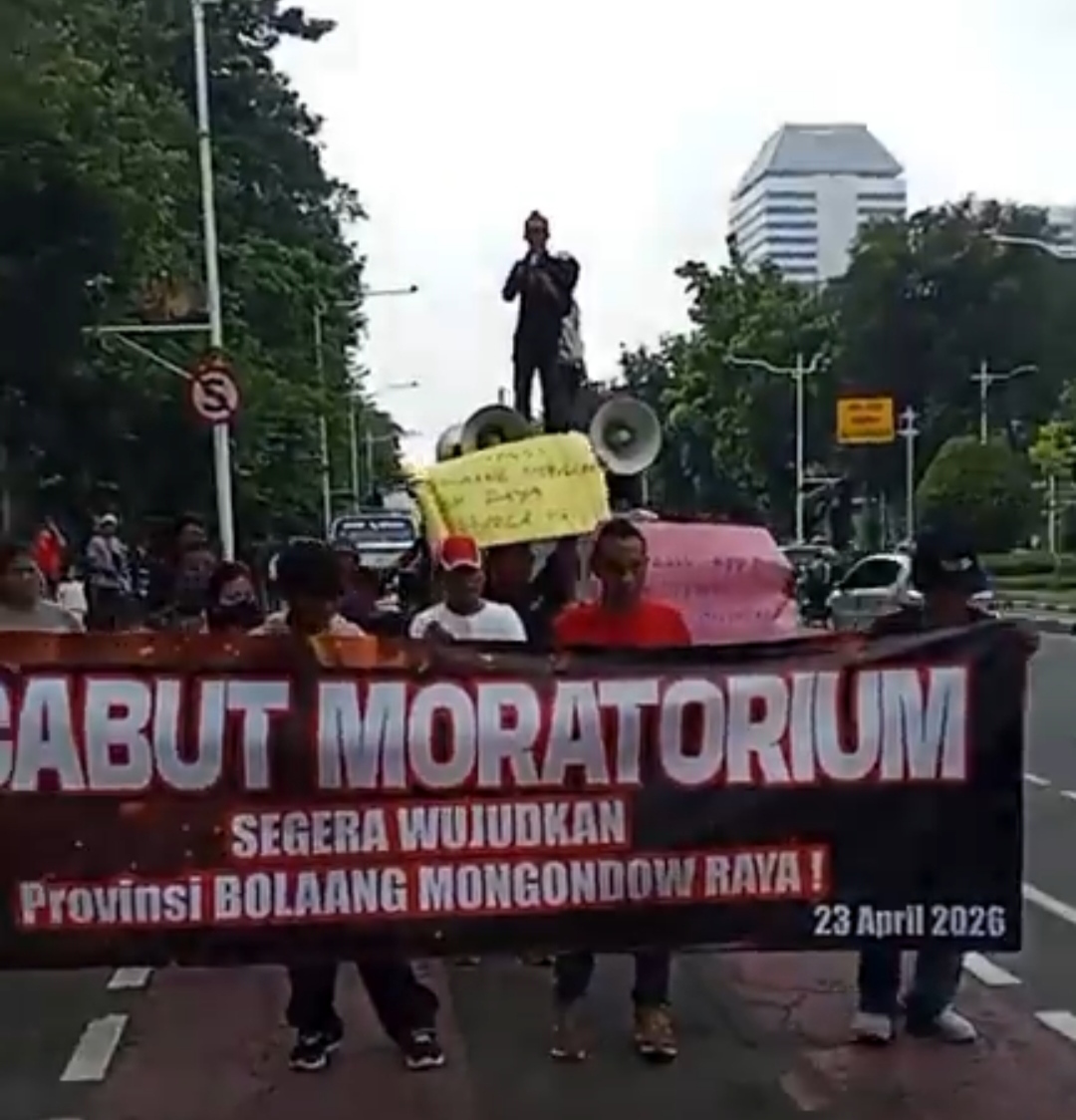 Puluhan massa yang tergabung di dalam aksi itu menyebut sebagai kelompok aksi dari Aliansi Percepatan Pembentukan Provinsi Bolmong Raya (AP3BMR), pada Kamis (23/4/2026).