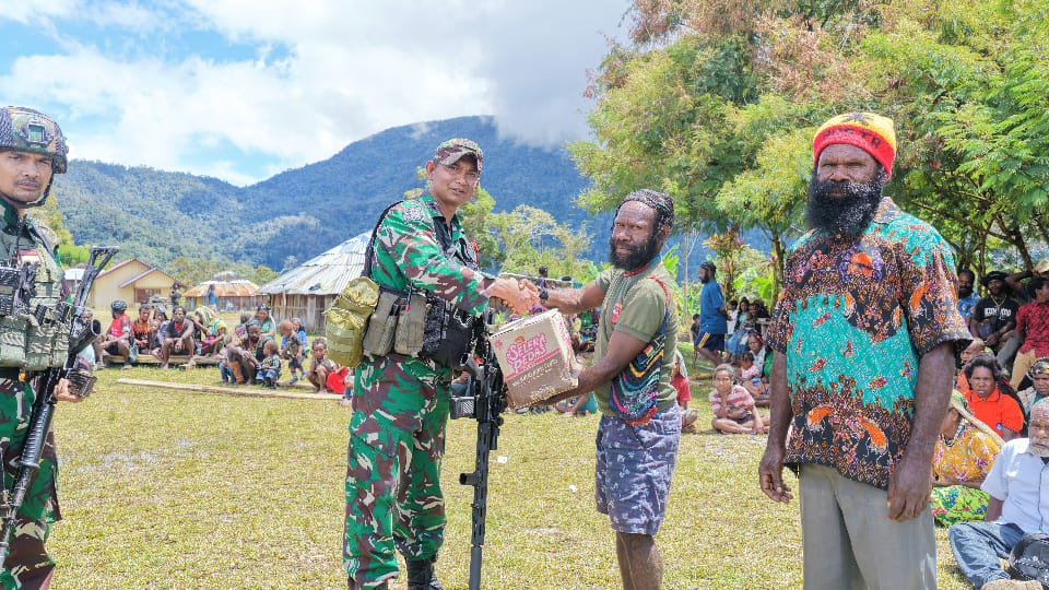 Setelah penyampaian arahan, dilaksanakan penyerahan bantuan sembako secara simbolis oleh Dandim kepada perwakilan masyarakat, Bapak Dianus Enumbi dan Bapak Yeli Walia.