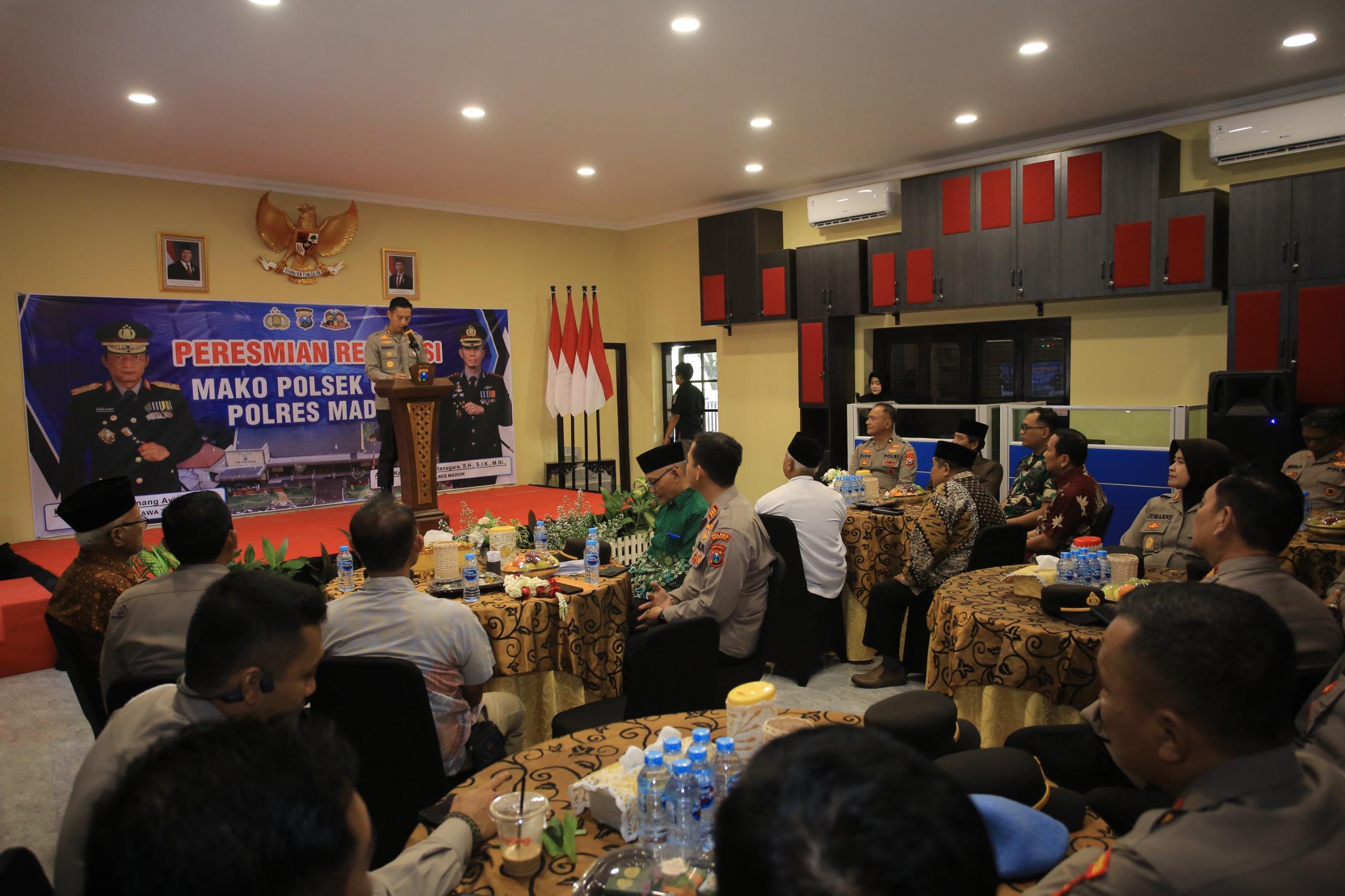 Dalam sambutannya, Kapolres Madiun AKBP Kemas Indra Natanegara menyampaikan bahwa renovasi Polsek Geger merupakan upaya peningkatan sarana dan prasarana guna menunjang pelayanan kepolisian kepada masyarakat.