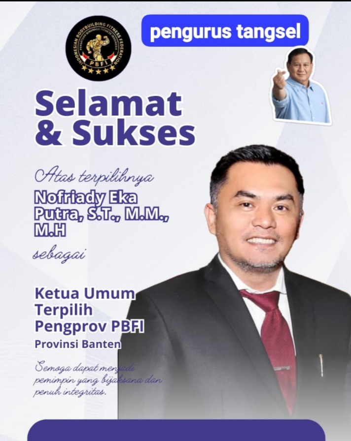 MPI, BANTEN – Nofriady Eka Saputra, ST., MM., MH. resmi terpilih sebagai Ketua Persatuan Binaraga dan Fitness Indonesia (PBFI) Provinsi Banten secara aklamasi setelah memperoleh dukungan mayoritas Pengurus Cabang (Pengcab) PBFI kabupaten/kota se-Provinsi Banten.