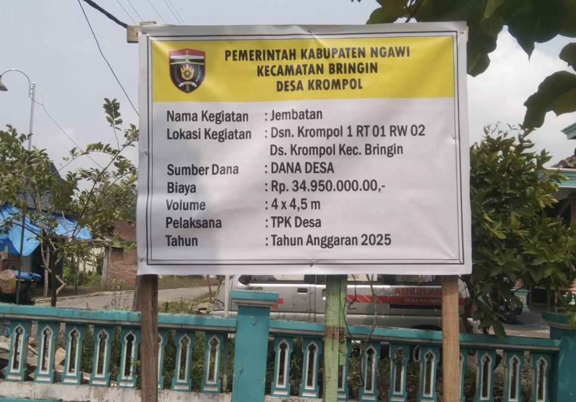 MPI | NGAWI ~ Pemerintah Desa Krompol, Kecamatan Bringin, Kabupaten Ngawi melaksanakan pembangunan jembatan yang menghubungkan menuju Dusun Krompol 1, RT 01, RW 02. Desa Krompol. Pembangunan jembatan yang memiliki volume lebar 4 meter x 4,5 meter dengan menghabiskan biaya sebesar Rp. 34.950.000,- yang bersumber dari anggaran Dana Desa (DD) tahun 2025.