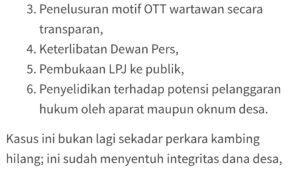 Kades yang bersama petugas dari Polda Jateng itu haruslah diselidiki lebih lanjut, apakah OTT itu legal…? Telusuri dan adukan APH hingga ke pihak Propam juga, karena janggal. Jika perlu diungkap kronologis dari awalnya hingga tanyakan Sprint Polisi yang melakukan penangkapan OTT kemarin. Semoga tidak ada kesalahan prosedur yang dilakukan oleh pihak Kepolisian ataupun di sisi hukumnya Kades. Dugaan persekongkolan antara Kades dan oknum Petugas juga bisa dipertanyakan”, imbuhnya.