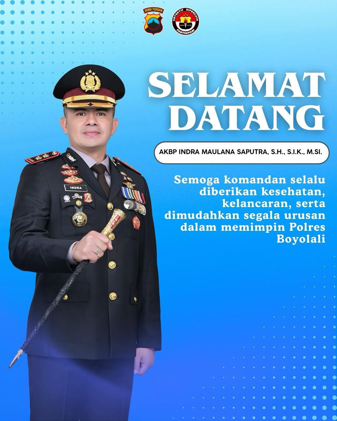 MPI, Boyolali – Media PatroliIndonesia.com mengucapkan selamat datang kepada AKBP Indra Maulana Saputra S.H.,S.I.K.,M.H. yang baru saja menjabat sebagai Kapolres Boyolali, menggantikan AKBP Rosyid Hartanto yang kini bertugas sebagai Wakapolrestabes Surabaya.