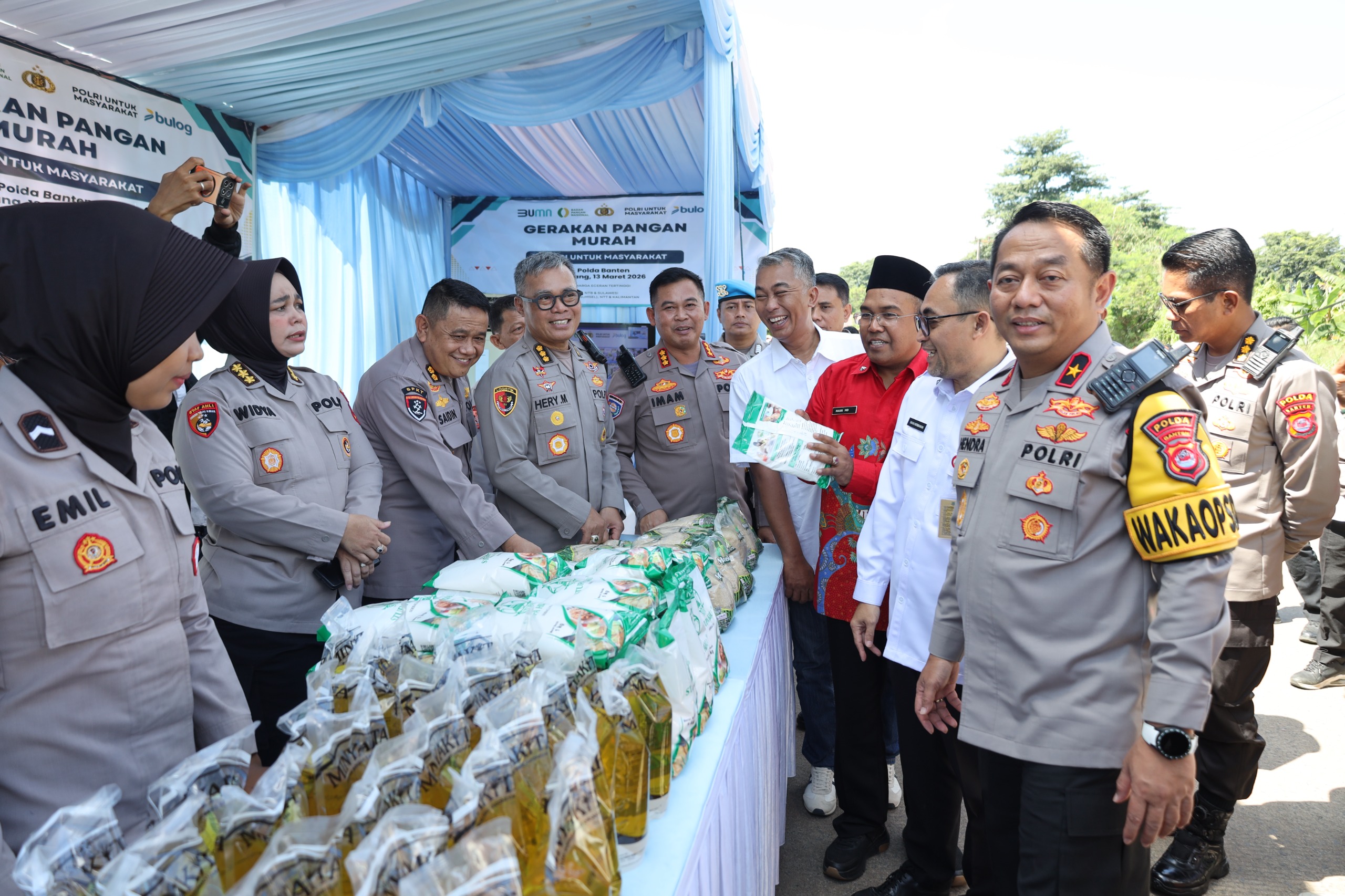 Dalam kegiatan tersebut, Wakapolda Banten bersama Dirbinmas Polda Banten meninjau langsung sejumlah stan penjualan bahan pangan yang menyediakan berbagai kebutuhan pokok, seperti beras, minyak goreng, gula pasir, dan bahan pokok lainnya dengan harga lebih murah dibandingkan harga pasar.